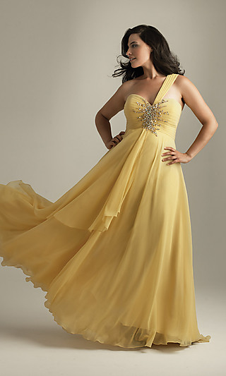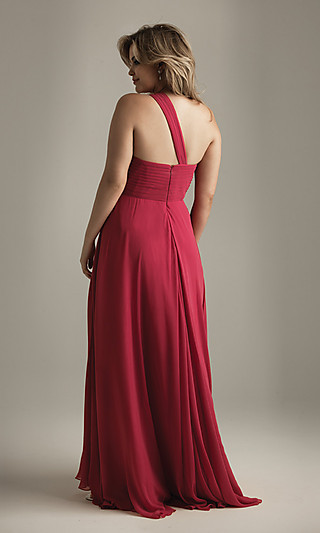This one shoulder plus size prom dress is from Night Moves, a leading dress designer known for their elegant evening gowns and reputation for high quality. This long one shoulder plus size dress for prom features a single strap bodice and a floor length A-line skirt with a small train that is glamorous as well as comfortable. A beaded accent on the ruched bust line adds a touch of sparkle to this shimmering gown and the luxurious chiffon fabric is available in beautiful spring colors including Fuchsia, Yellow, or Navy.