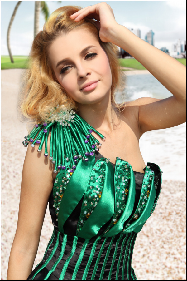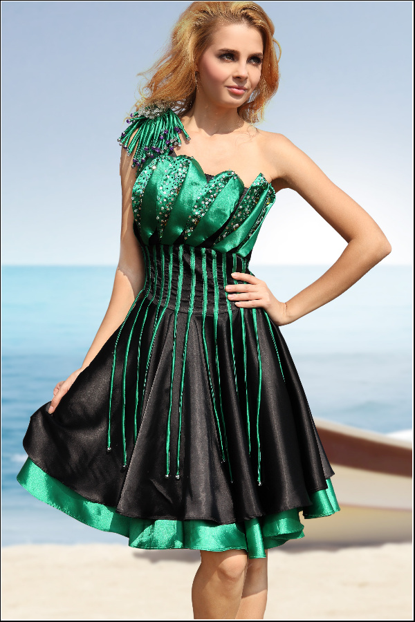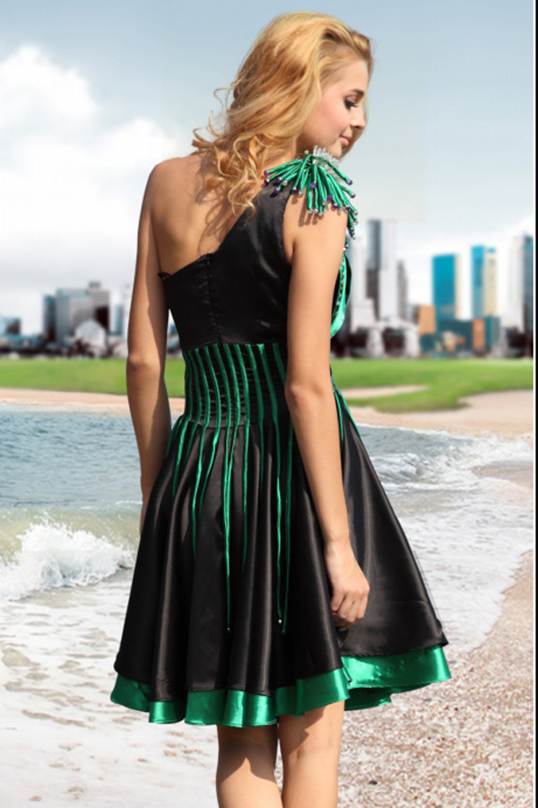 Sing your cares away with this emerald city green cocktail gown that resonates with Oz-like charm. You'll be sure to laugh the night away with this exquisite one-shoulder couture design that shines and captivates. Two-layer black and green skirt hits at knee for most women of average height.