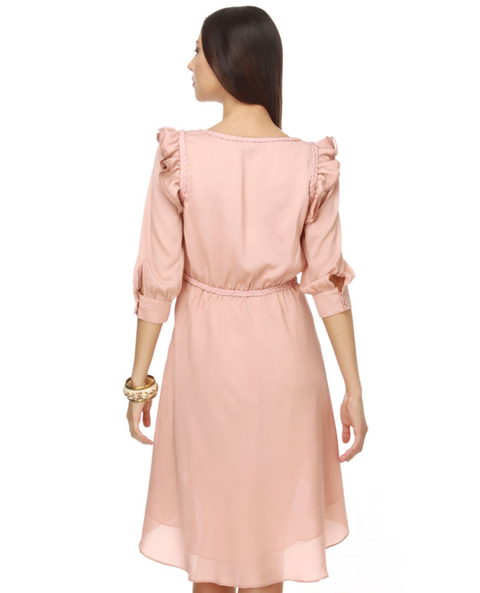 Be a delightful damsel in the Fair Maiden Dusty Pink Dress. With a high-lo sprained ankle treatment that will add some Renaissance-style flair, this dress has the details that make the real difference! Braided accent at the collar and also the softly ruched waist add type and give a retro think! Pretty ruffles at the shoulders are generally feminine and sweet, when key hole openings from two-button sleeve cuffs finishes it off nicely. Invisible side zipper. Dress is repleat. Model is wearing dimension small. Small measures 33" glenohumeral joint to hem. 7" longer in back. 18" sleeve. 36" bust (relaxed). 26" waistline. 97% Polyester, 3% Spandex. 100% Polyester Lining. Fretting hand Wash Cold. Imported.