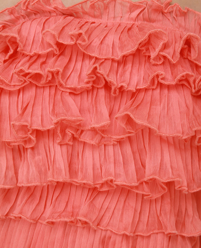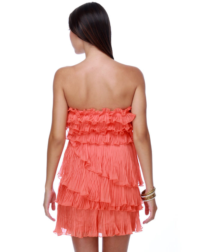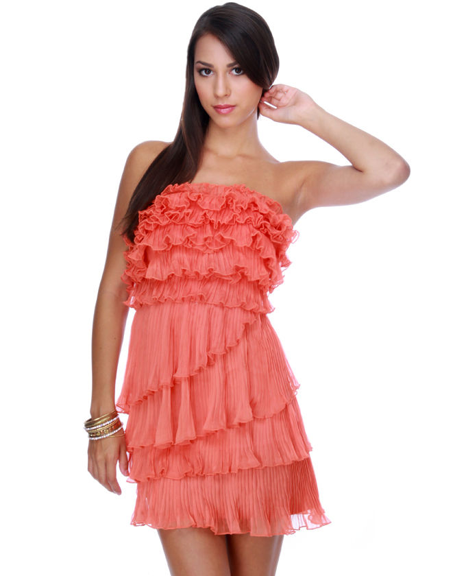 Find excited all you girly-girls; the Foofoo Ca Chu Strapless Coral Dress is anything frilly and fanciful you could have previously wanted! Tiers of pleased coral-orange pleated and crinkled chiffon descend from bustier bodice to hem in a quantity of romantic ruffles, with a middle tier breaking the mold within asymmetrical fashion. Pair while using the perfect T-straps and a pop connected with colorful lipstick to complete the design! Fully lined. Model is wearing a small. Small procedures 27" long. 30" bust. 27" waist. Personal: 100% Polyester. Contrast: 100% Cotton. Less than Layer: 100% Cotton. Polyester Filling. Dry Clean Only. Imported.