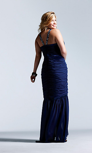 Name: Form Fitting Ruched Chiffon Dress with Beaded Straps