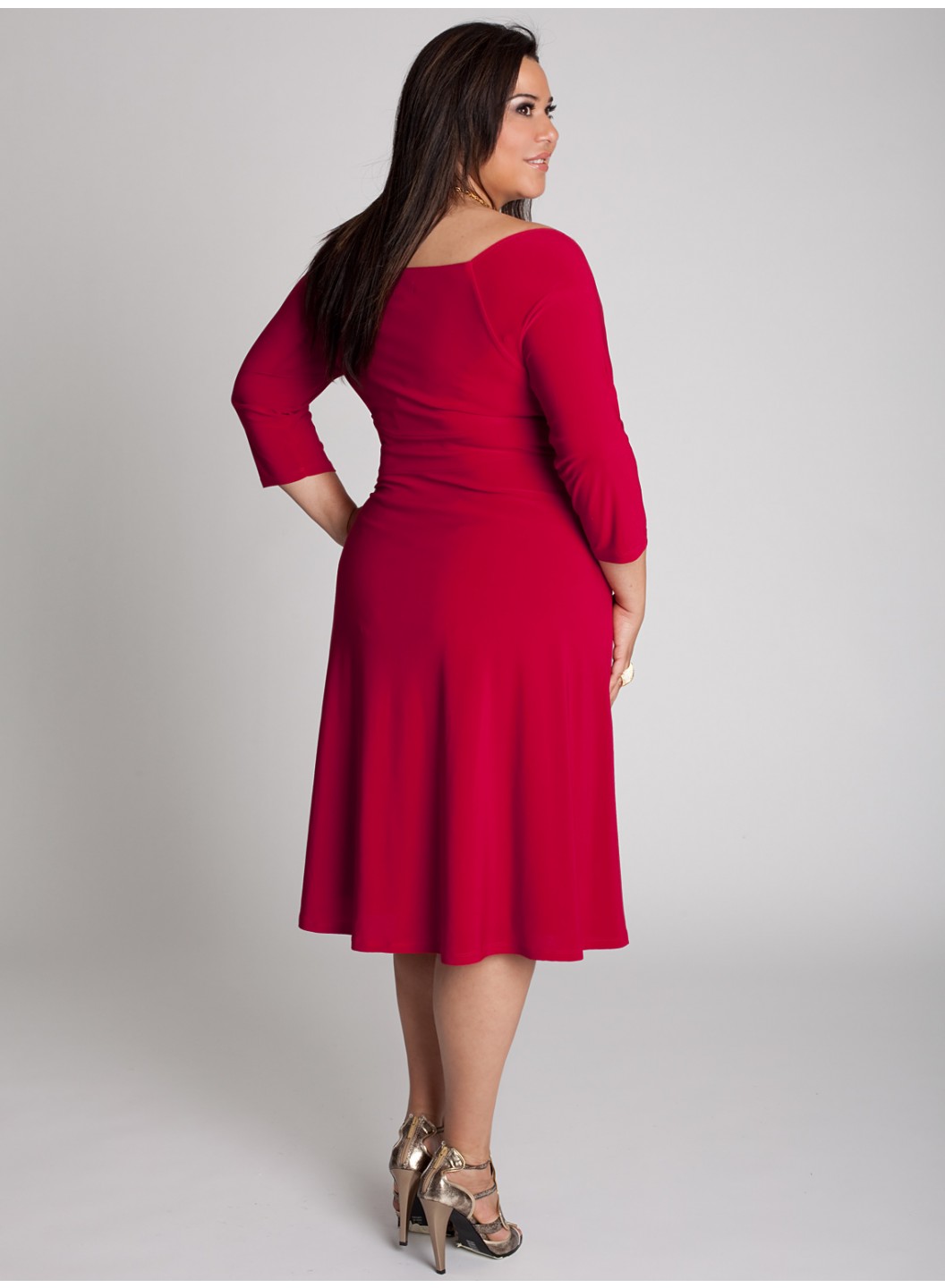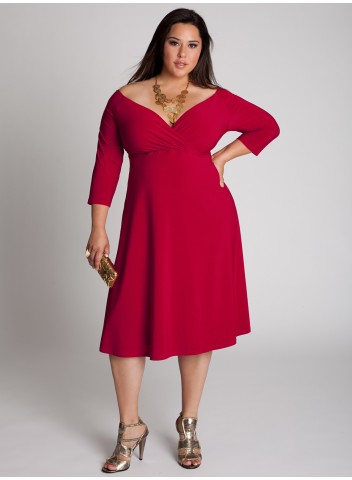Care: Dry Clean OnlyOn or off-shoulder necklineDraped surplice bodiceEmpire waist3/4 length sleevesJust-below-the-knee flared skirtFully lined