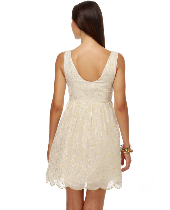 Create your own fairytale and skip your porridge! Fill up on chocolate and also bon-bons instead in the fit-for-a-princess new Goldi-Frocks Impress Gold Dress! Beautiful cream-colored silk-blend chiffon is thorough with glimmering gold threads through padded bodice to scalloped hem, even though hidden layer of ivory organza adds regal volume. Hidden side zipper/hook clasp. Completely lined. Model is using size small. Small actions 34" shoulder to hem. 32" destroy. 26" waist. Self: 70% Silk. 30% Bamboo. Contrast: 100% Polyester. Lining: 95% Cotton. 5% Spandex. Dry Clean Only. Imported.
