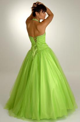 Full gown in tulle over satin with halter neck and back lace-up. Jewel detail to centre bust pleats and scattered beading throughout gown. Full tulle skirt.