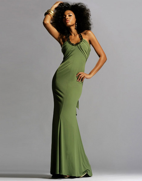 Modified halter prom gown with beading along the straps and a tie back.Comes in black, hot pink, olive, and white/black.