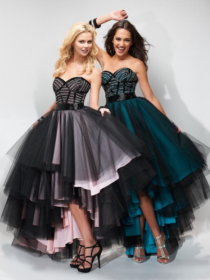 Intricate, contrasting beaded bodice explodes into a layered high-low tulle gown with contrasting lining. Corset back closure for the perfect fit.
