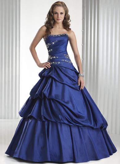 Three tiered caught-up ball gown featuring beads and jewels that shimmer throughout the bodice in this taffeta corset back gown.