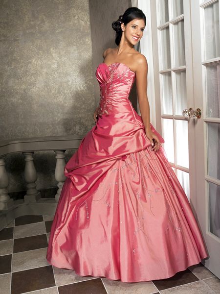 This kind of taffeta and satin ball gown features strapless design,beading and embroidery embellishment on the pleateded bodice.Underskirt is inculded.The similarity of photograph is 95% ,but the embroidery has little difference probablay. This dress is available in other colors.