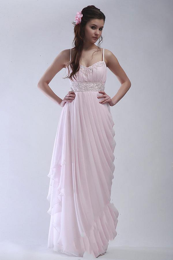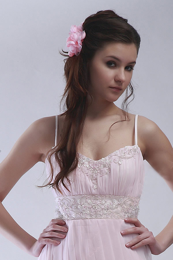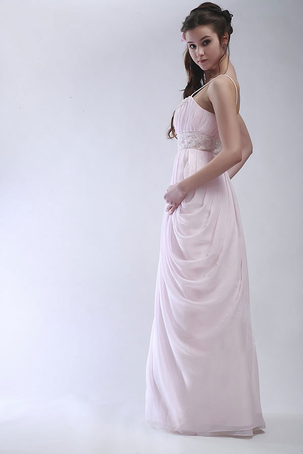 She'll look just like a Grecian goddess in this long, white beaded prom gown. The classic drapes of Greek statues never looked as good as the gathers on the skirt of this stunning column of a dress. A wide beaded band at the waist, accompanied by more beading at neckline, make this white gown look like starlight come to earth. Thin straps and a cascade of tulle at one side add to the extraordinary style of this singular dress. The design will especially compliment any tall, lean young lady who can benefit from the fullness around the skirt. A truly exquisite choice for a prom dress.