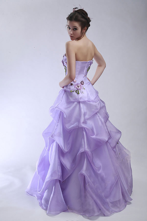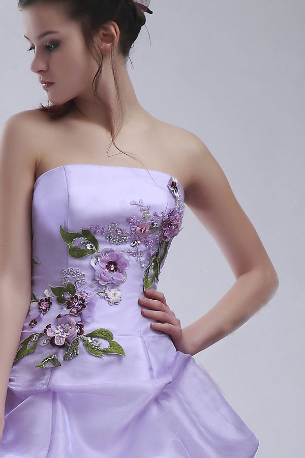 What could be dreamier than lavender satin? How about lavender satin embellished with a scatter of beaded appliqués of flowers? Add a strapless bodice and three layers of gathers over the ball-gown skirt and this is a prom dress to make everyone breathless! The young lady who chooses this amazing confection for her prom dress will find a glamour she never knew she had and draw compliments as if she were walking into a Hollywood movie. Perfect for a pair of stunning chandelier earrings and a single glittering bangle, this dress was designed to make its wearer the belle of the ball.