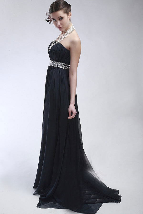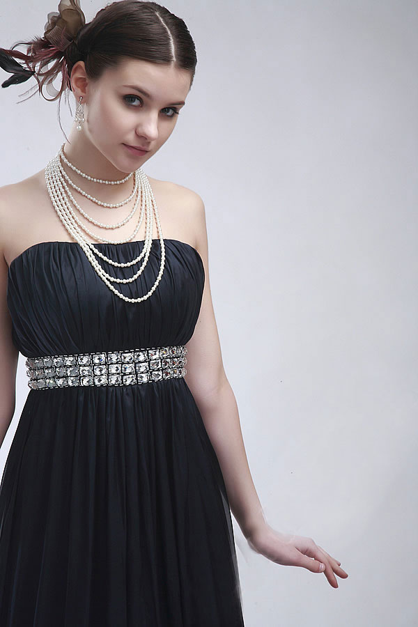 This striking gown could hardly be called a "little black dress." So let's call it a Big, Bold, Beautiful Black Dress! Classic styling with a strapless bodice and full, flowing, floor-length skirt are tied together magnificently with a wide silver waistband topped with three rows of giant clear crystals. This showstopper of a prom gown can be taken over the top with lots of jewelry, or allowed to shine on its own in nothing more than the glow of its own brilliance. This is the kind of classically styled evening gown that can be a staple of any young woman's wardrobe for formal events.