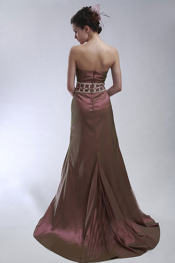 Get bronzed with this bronze beauty of a long prom gown A satin fan accents the left top of the bodice. A wide gold embroidered belt angles across the strapless bodice and wraps down to the waist, winking with reddish crystal beads in rows of squares. The embroidery catches up a gather at the waist, creating a beautifully draped fold in the full, floor-length skirt. Call its shade bronze or milk chocolate or something else, this gorgeous gown belies the myth that brown is a dull colour. Wear this gown to the prom and watch everyone's eyes pop out in amazement.