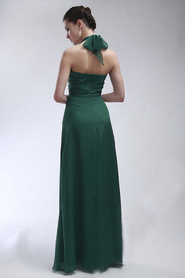 Here's the perfect dress for the young lady who revels in lush understatement. A halter-style column gown in forest green will bring a welcome respite from the many glittering gowns sure to come out on prom night. Demure yet delightful, this long, lean look is perfect for an athletic young lady who wants to look sophisticated rather than overdone on her special night. A wide waistband accents the form-fitting bodice, which ties into an attractive bow at the back of the neck. While slender, there's more than enough movement in the graceful skirt to take to the dance floor at every opportunity.