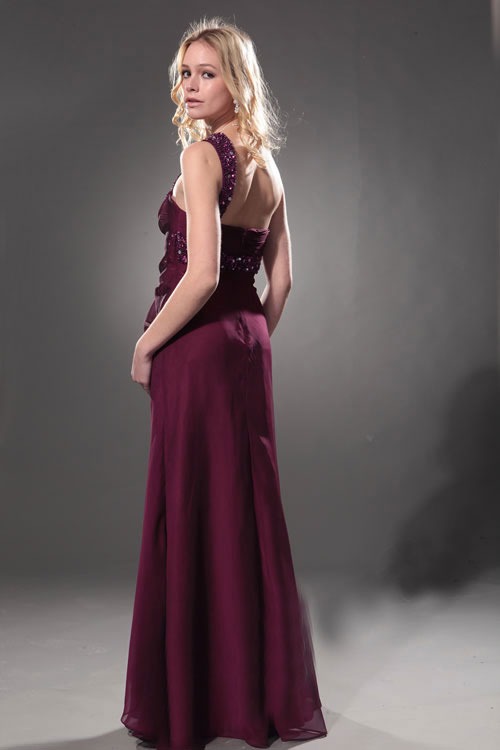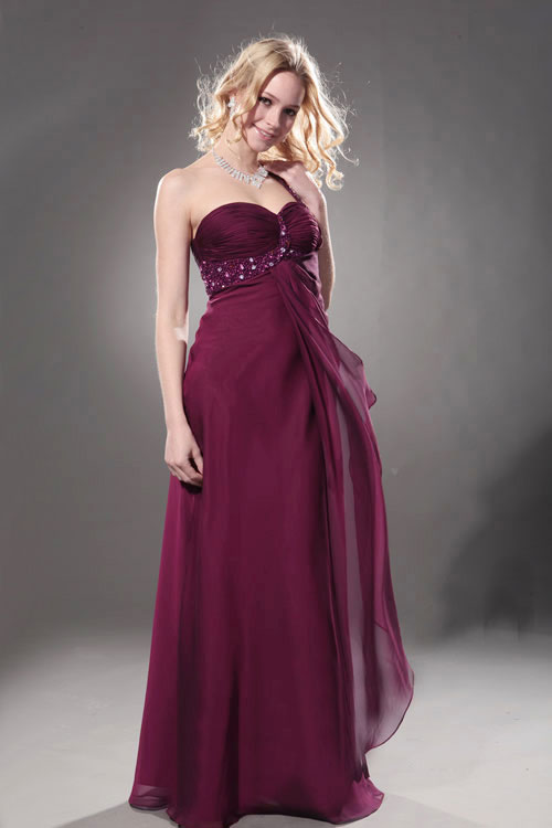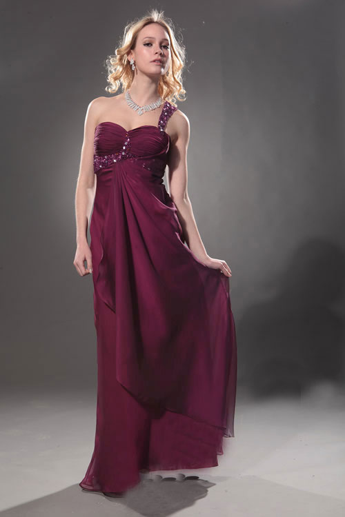 A deep wine-grape shade, the dramatic colour sets off the one-shoulder style to perfection. The traditionally royal shade of purple turns this stunning dress into a gown fit for a princess on her prom night. The single strap, decorated in shimmering sequins, wends its way over one shoulder and around the bodice, where it meets up in front with a sweep of floating tulle like butterfly's wings. Whether gliding around the dance floor, sipping punch with her beau or posing for a prom picture, the young lady who wears this gown will surely be the belle of the ball.