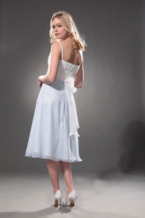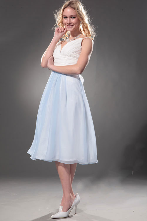 Gathers of flowing tulle cover both the bodice and skirt like the blue-and-white froth of a new spring brook. The plunging neckline contrasts with the high-flying wings of the bodice as tiny straps slide over her shoulders. The straps meet the back bodice above the waist, where a feminine bow of white tulle falls into eye-catching streamers. In short, this extraordinary dress will stop traffic whether she's coming or going on her special prom night.