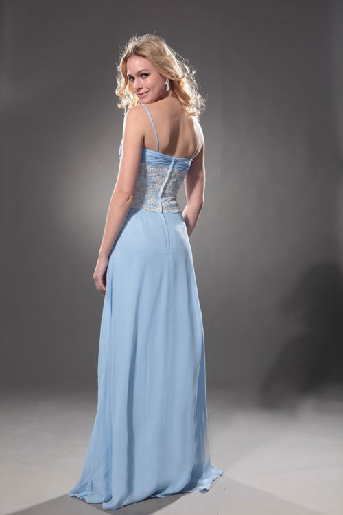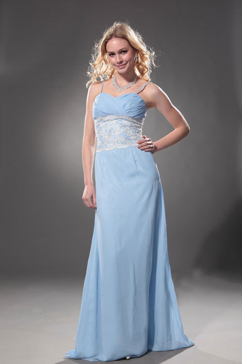 Everything goes to waist in this pale blue confection of a prom dress. Perfect for the young woman athlete who keeps herself in top shape, a wide swath of lace accented with shimmering beads turns a simple blue gown into a prom night knockout. Delicate thin straps support the ruched bodice above a floor-length skirt of tulle over satin. The loveliest of spring skies aren't as delightfully blue as this traditional gown, which takes a familiar dress style and transforms it into something resembling a twinkling dawn after the greatest prom night ever. Being blue never caused so much joy!