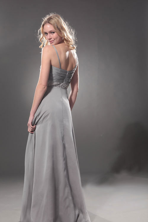 Fashionistas everywhere know that details make the ensemble, and this beautiful prom gown doesn't lack for stunning detail. A traditional ruched bodice tops a floor-length skirt with the tiniest hint of a train, while a single drape flows down the skirt front. One shoulder bears a barely-there spaghetti strap while the other shoulder flowers with a wide row of sequined satin that wraps around to form a glimmering waistline. Add to these style details a silver-grey colour like pale moonlight, and some lucky young lady has a dress that will make everyone gasp at her beauty come prom night.