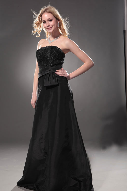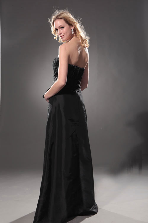It's a dress almost to die for: Floor-length black satin with a lace-encrusted bodice topped by a black lace shrug with three-quarter sleeves and wide ruffled cuffs. Its formal pedigree bespeaks the kind of quality that aristocratic women wore centuries ago, yet is generous skirt and strapless top put it right in the midst of its fashion contemporaries. Paired with simple evening jewels, this gown radiates the confidence of youth and the sophistication of maturity. The daring young woman who dons this dream for her prom night will tell everyone that she's ready to take on the world come graduation.