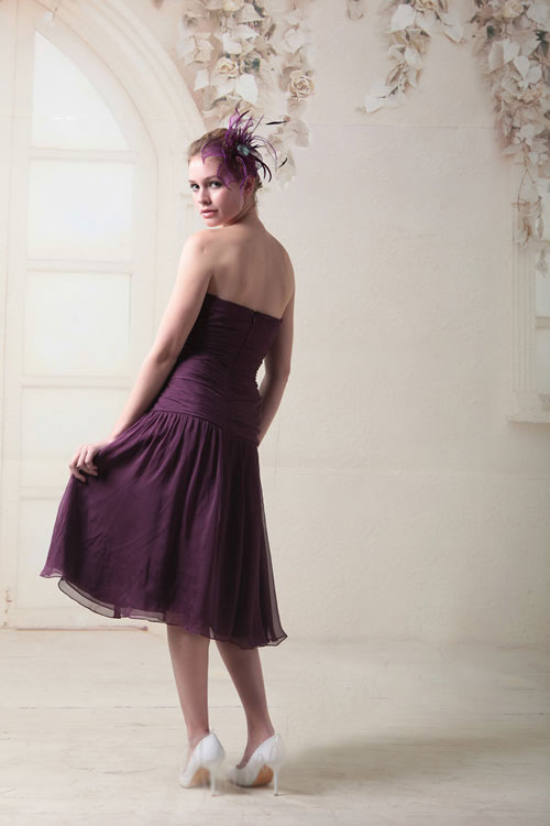 Who would expect such drama in a short prom dress? This strapless drop-waist down in wine-coloured tulle will make jaws drop in surprise at its stunning beauty. The drop-waist meets up perfectly with a flouncy little skirt that's sure to float out like a gorgeous flower when she and her escort take their turns on the dance floor. The design works well to disguise wider hips, while the intense colour gives her an ideal canvas for creating a prom ensemble of style and sophistication. Go for a deep monochrome combination or ramp up the contrast with gold, this prom dress earns top marks.