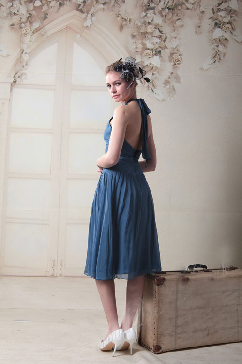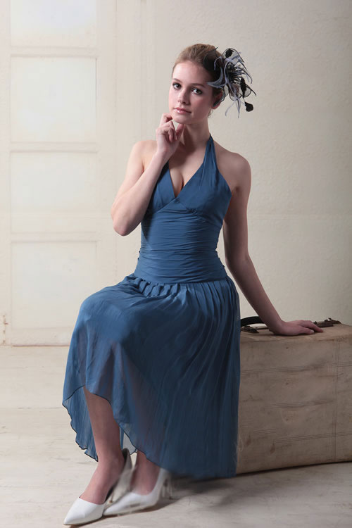 This lovely prom dress combines elements of style in unexpected ways. A halter top with wide straps combines with a form-fitting waist to give the bodice a long, lean look. Meanwhile, the gathered skirt drapes beautifully to a comfortable length just below the knee - a perfect length for prom dancing without the encumbrance of a floor-brushing train. Its slightly smoky medium-blue colour ties the design details together in an attractive, eye-pleasing package. This is a good style for a young athlete such as a gymnast who'd like to add some length to her compact form, but there'll be nothing compact about the praise she'll get in this gown.