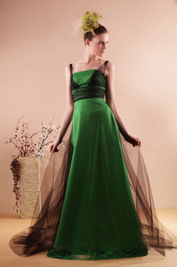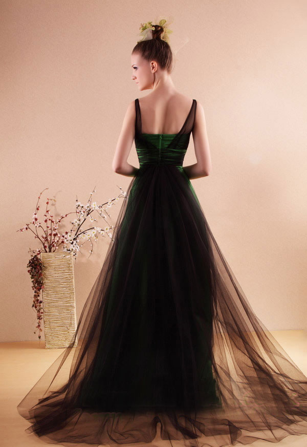 These prom dresses are emerald green masterpieces with two contrasting facets. Firstly the basic strapless dresses follow a gentle A line to widen slightly to floor. The hem line of the prom dresses is beautifully crafted and embroidered all around. These seemingly simple prom dresses are radically modernised by a valiant, black, sheer fabric. In the front the black layer is wrapped around the chest below the bodice and forms two straps leaving a wide neckline. Quickly the prom dresses are transformed by the black sheer layer at the back as it forms a wide and elegant train. Striking and appealing these prom dresses make an unforgettable statement while still retaining a refined sense of class.