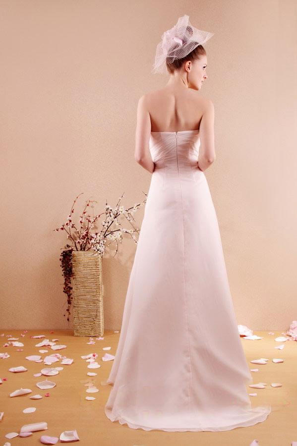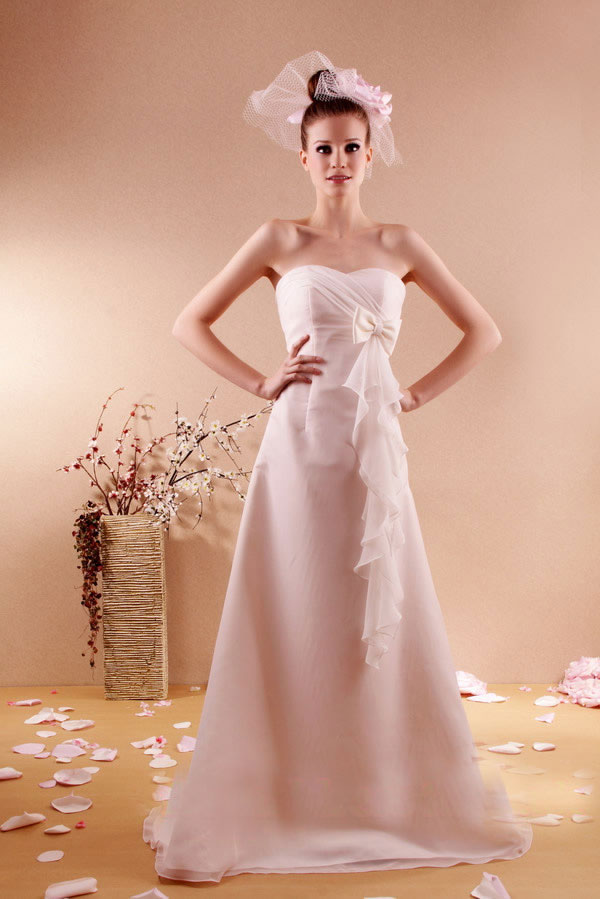 There are some prom dresses that are classic; this dress is one of them. Elegant and tasteful prom dresses offer the most complementary neckline for a young woman. The strapless gown shows the beautiful lines of a graceful neck and toned back. The right side of the bodice sweeps over to the left side gently. A sweet bow lies underneath the bust line and the floating fabric cascades from the bow and ends at knee length. Prom dresses featuring the A-life silhouette are flattering. This pastel-hued dress trails behind with a lovely ruffled edging to the bottom of the dress.