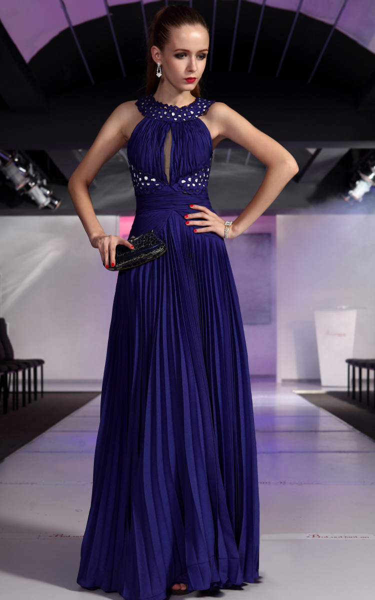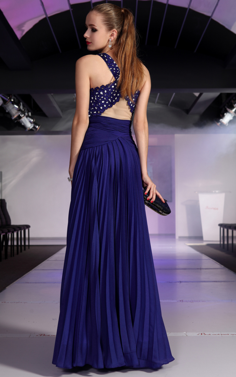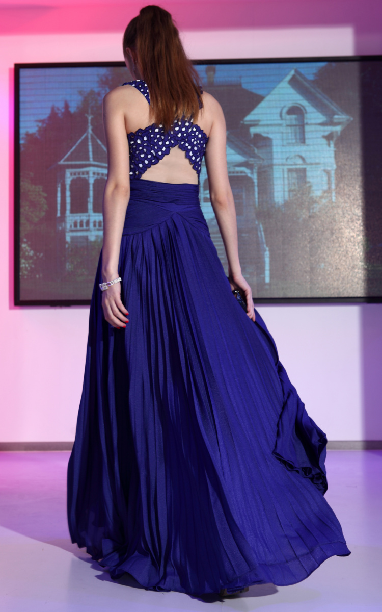 This sleek royal blue evening gown is great for formal occasions. You will look sleek, beautiful, and elegant. This dress has an A-line top, and an empire waist. There is sparkling sliver beads over the waist line, along the neck line, and along the back.