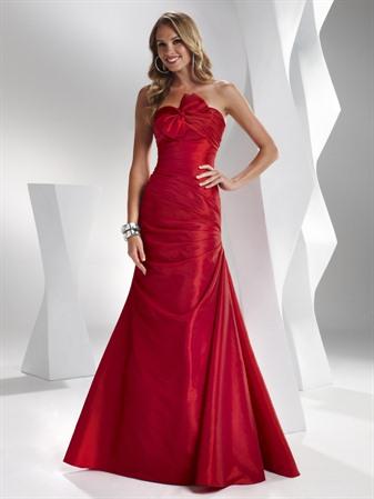 Strapless taffeta fit-and-flare featuring ruched bodice, asymmetrical bow at neckline, and corset back.