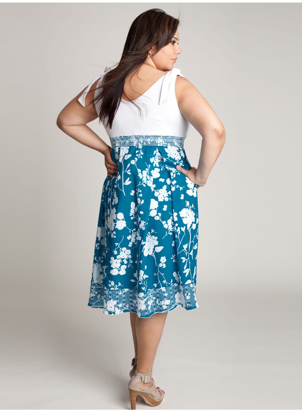 Care: Dry Clean Only Surplice cotton jersey bodiceAdjustable self-ties are bra friendlyPrinted waistband is smoked for style and comfortA-line printed skirt hits below the kneesFully linedSide sipper