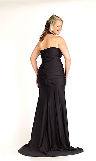 Plus size halter top body hugging formal dress with flattering ruching detail.