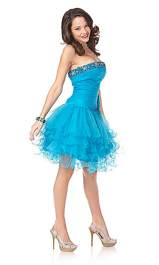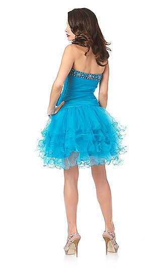 Short strapless mesh party dress with ruched bodice and full skirt.