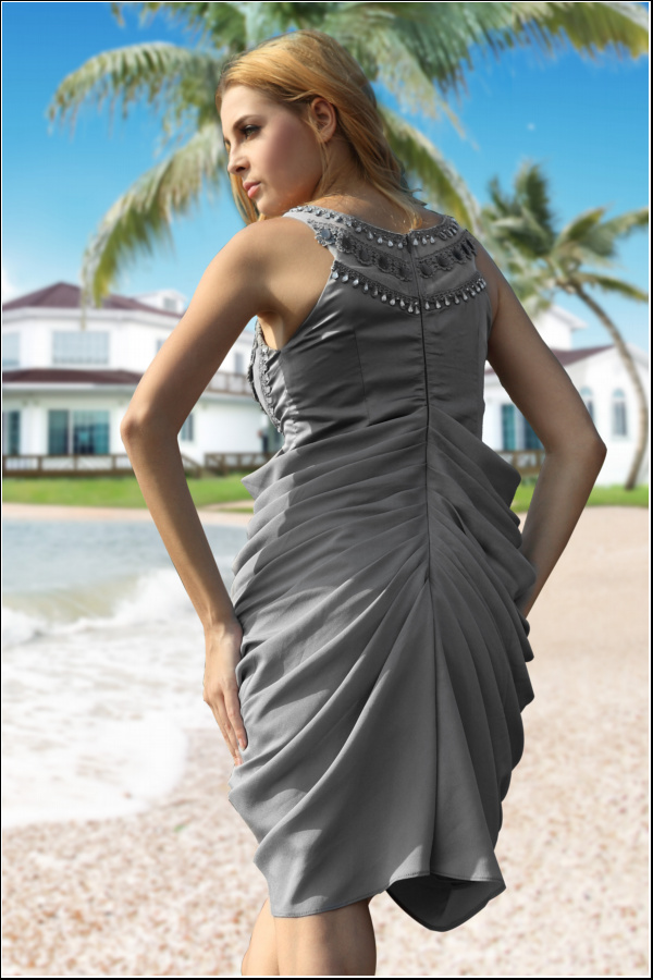 This short and sweet gray bridesmaid dress is simple yet lovely. Elegant draping curves of decor line the modest bust that is excellent if you've got large-chested bridesmaids. The front drapes down to a partially open slit (there is an underskirt layer), and the back is designed to compliment women with shapely features. This gray bridesmaid dress is a winning choice for a bridal party of varying shapes and sizes. Remember - contact us if you need custom sizes.