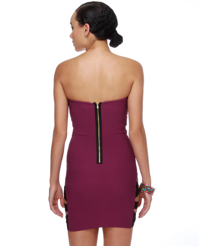 Everyone knows it's not polite in order to stare, but they'll positive be trying to sneak an appearance of you in the hot fresh Side Glance Strapless Magenta Dress! Stretchy medium-weight knit has a sweetheart neck-line and seamed bodice, but the real attraction comes from the smokin' hot part cutouts along each thigh. Supple black bands criss-cross so as not to disclose too much! Exposed gold zip at back is trimmed in black. Front associated with bodice is lined. Model is actually wearing a size tiny. Small measures 27" Long. 24" Midsection (relaxed). 26" Bust (relaxed). 95% Cotton, 5% Spandex. Hand Wash cold. Made with Love in the U.Ohydrates.A.