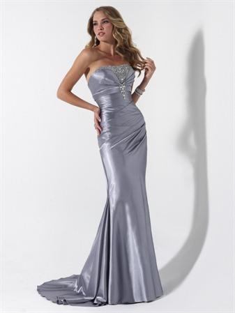 Strapless sheath in slinky satin featuring sweep train, ruched bodice, beaded encrusted inset at neckline with brooch embellishment at empire waist, and corset back.