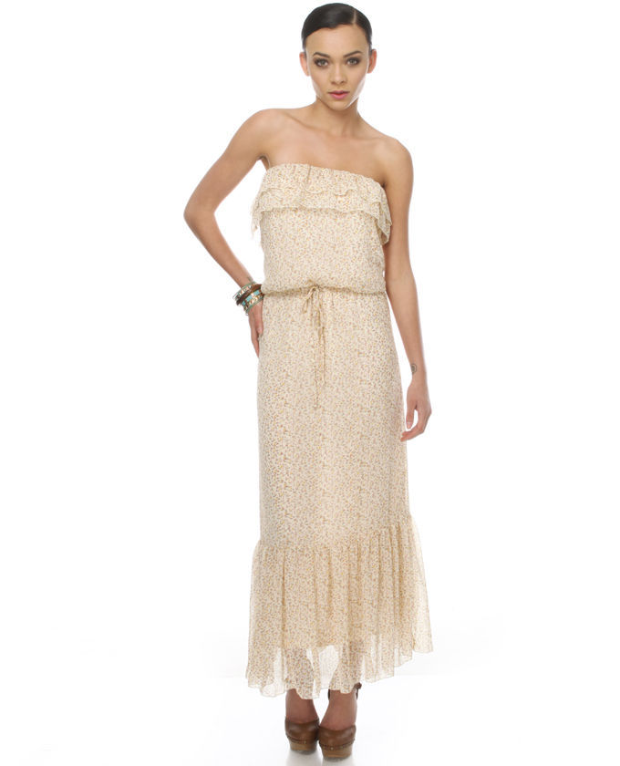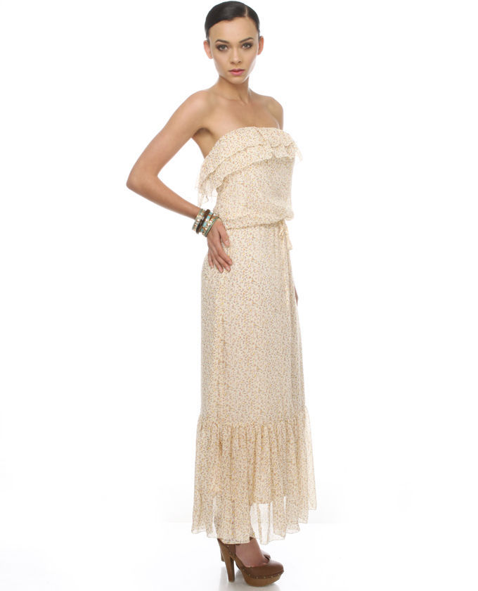 AS SEEN IN PEOPLE STYLEWATCH!! Make an air of mystery plus allure in the softly going Strangers In the Wind Strapless Floral Maxi Dress. Soft cream chiffon is protected in a bouquet of modest dainty flowers for the glimpse of a silent meadow. Not one but two rows of ruffles falls inside of a soft flounce from top of elasticized destroy, while drawstring waist creates the best figure-flattering silhouette. Additional flounce at base sways gently from gathering. Dress will be lined. Model is using size small. Small options 50" long. 32" bust (relaxed). 30" stomach. 34" hip. 100% Polyester. Hand Wash Cold. Imported.