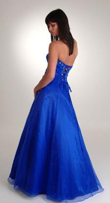 Organza gown with full a-line skirt and calico liner for shape. Flattering wrap over bodice. Lace up corset style back. Jewel beadworks and tonal embroidery to accent.