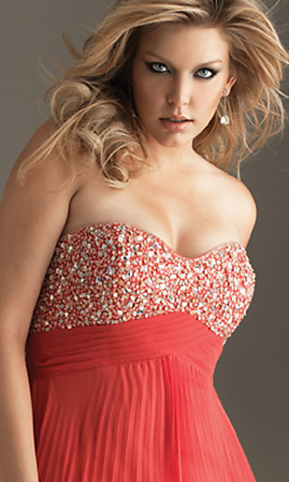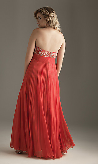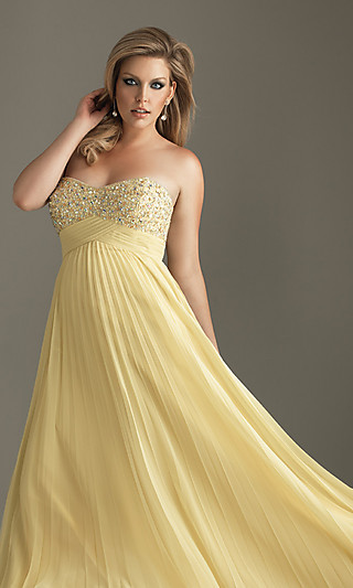 Create a fabulous look for spring in this lovely strapless full length beaded dress from the Night Moves 2011 plus size prom dress collection. A soft feminine strapless evening gown in aqua, yellow, or watermelon red featuring a beaded bust with a sweetheart neckline. The empire waist flatters your figure and the floor length skirt is vertically pleated to create a loose fit that will look amazing as you float across the dance floor at your prom or formal.