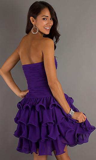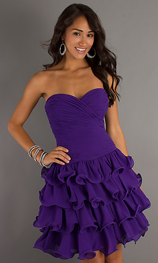 Short strapless sweetheart dress with ruffled a-line skirt.