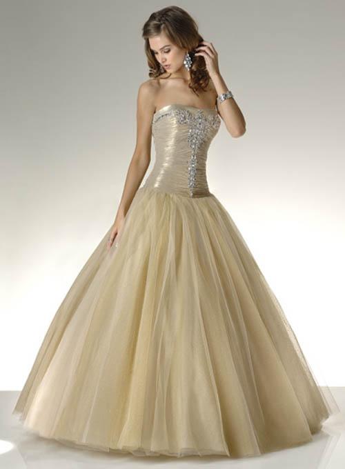 This champagne prom dress made by tulle with a sweetheart strapless neckline,accent with beads on the bodice,full length corser back.