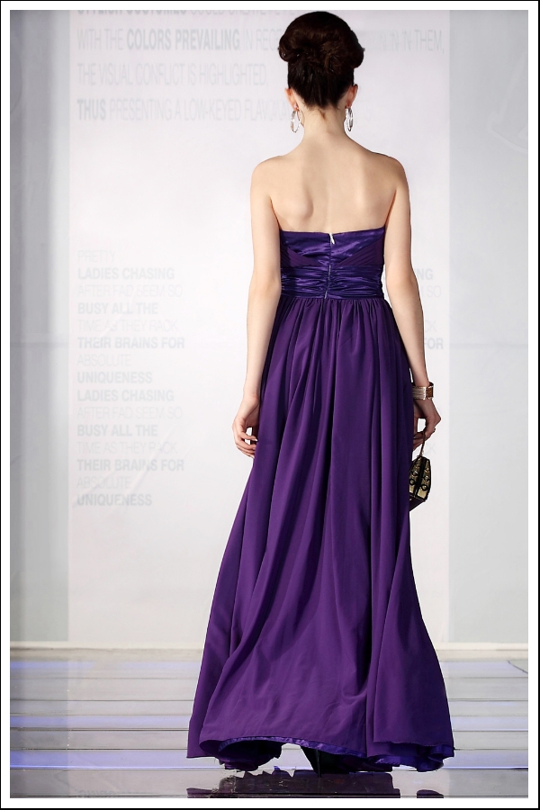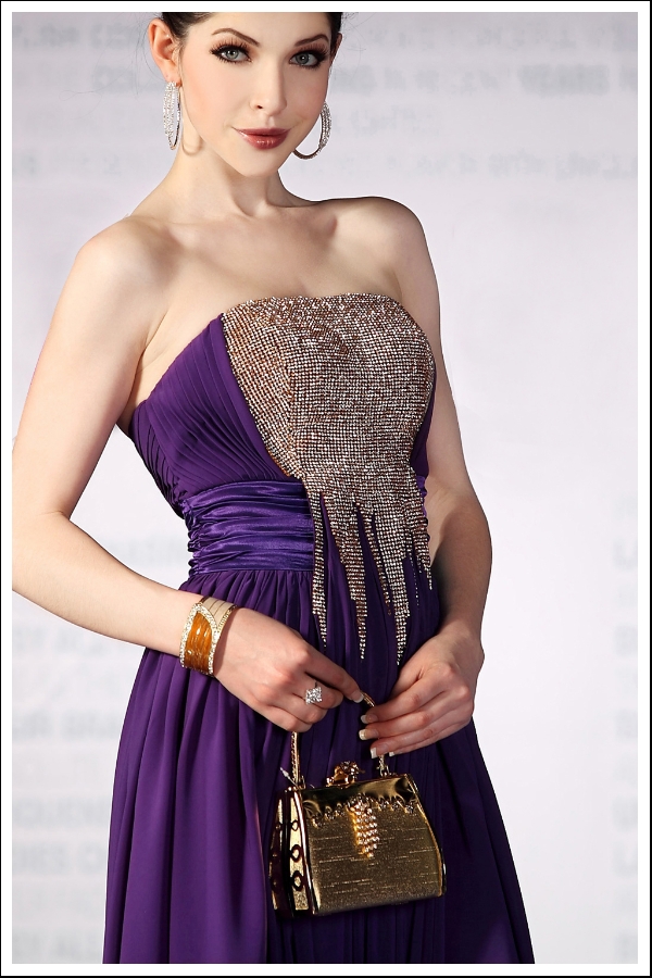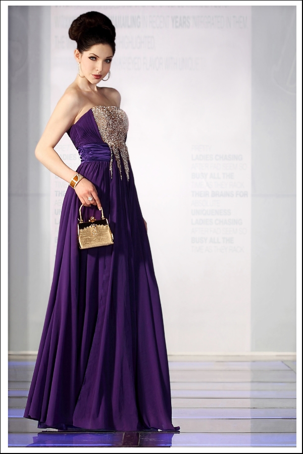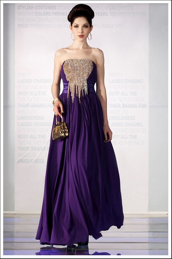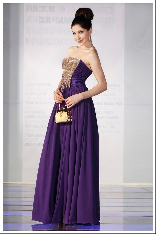 Unlock the splendor of beauty with this radiant strapless gown. The strapless bodice appears to be dipped in gold for a luxurious, treasured look. The combination of royal purple and gold demand reverence and attention in positive light.