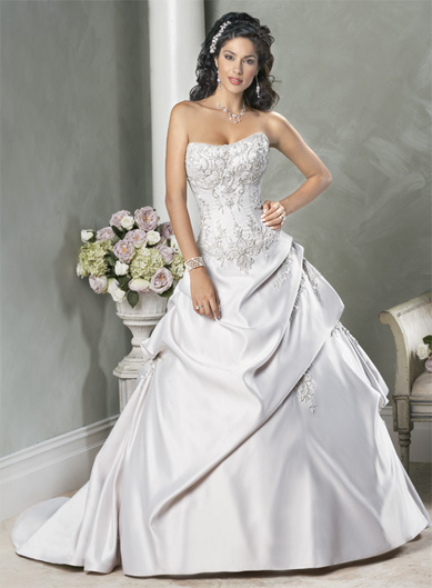 Our fashion style of wedding dress combines all the essence of the traditional beauty and combines the extraordinary modern elements. Fancy silhouette with charming elements creates a fantastic look. Sumptuous wedding dresses appreciate soft neckline dotted with glittering embroidery and beaded motifs over the pleated bodice. Natural waistline reveals the full skirt running down to the floor with a graceful chapel train.