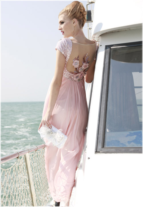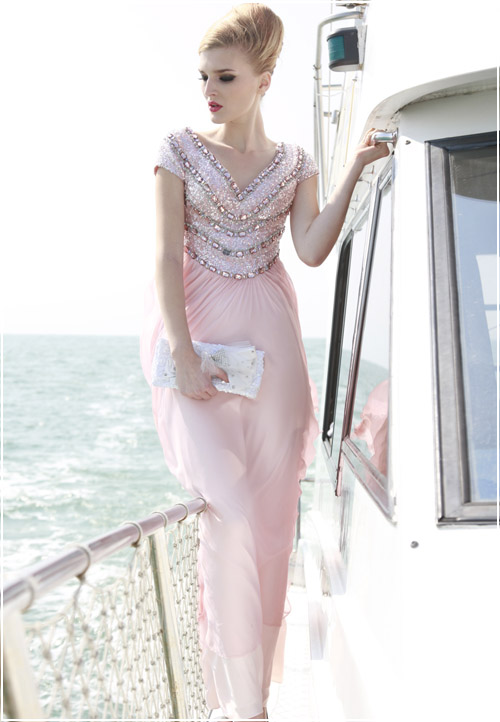 Rule the night in this frosted pink short sleeved modest evening gown. A sequined and jewel encrusted v-neck bodice with short sleeves leads gracefully into silky, flowing skirt. Everyone will love your dress from the front, but when you turn around they will be awed with a low scoop back covered in sheer material embellished with pink roses.