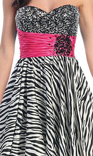 Short strapless sweetheart zebra print dress with empire waistband.