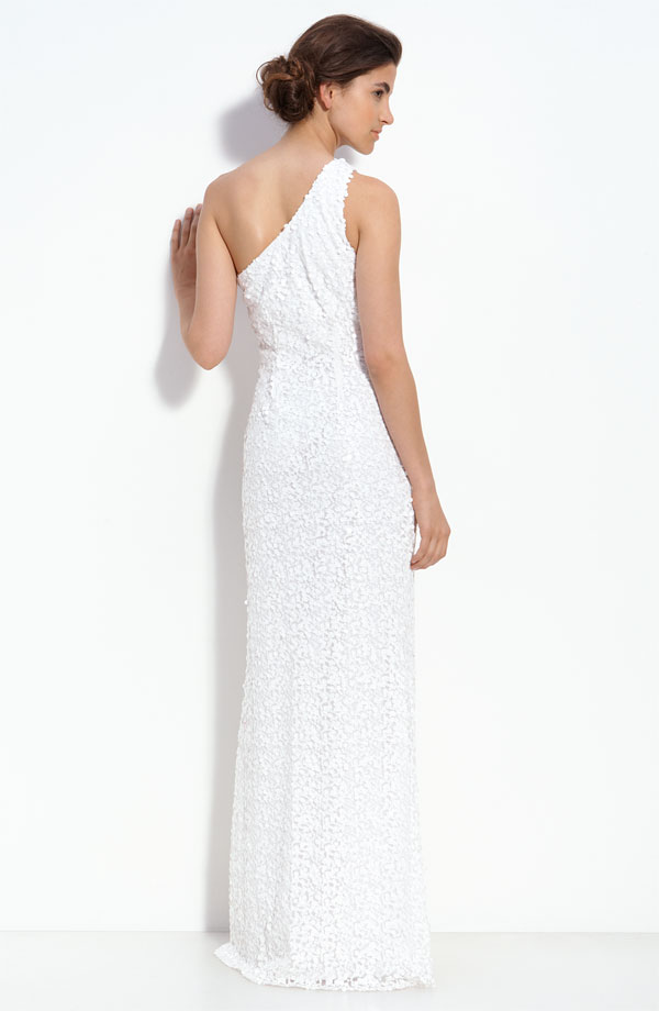 Shimmery sequins and paillettes lend dazzling texture to the sheer mesh overlay of a one-shoulder gown with a slight train in back.