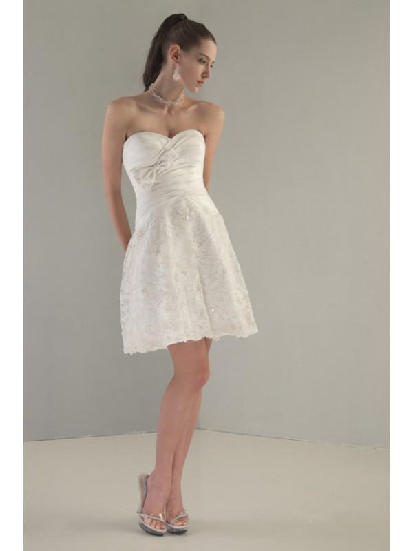 Short strapless taffeta mini with sweetheart neckline.Bodice accented with bow.Skirt has beautiful lace overlay with scalloped hemline.