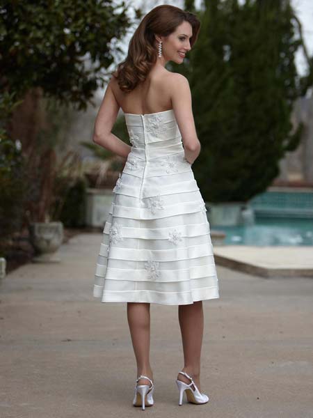 FABRIC: Wedding Gown Davinci 8443. Satin and organza banded knee length gown with straight strapless neckline adorned with three-dimensional floral appliques