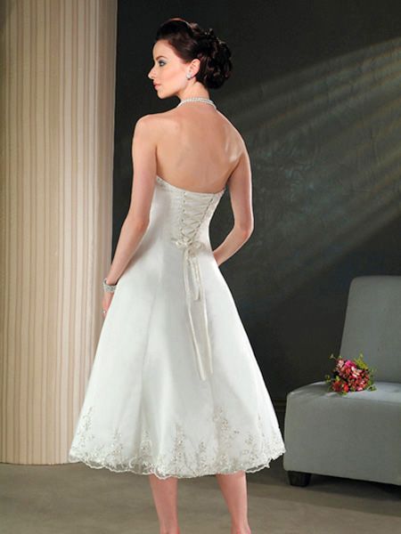 This wedding dress features its tea-length design, its spaghetti straps design and its beading decoration. It is made of satin.