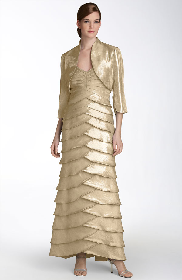 Elegant, overlapping tiers shape the skirt of a shimmery gown textured with shutter pleats at the bodice and completed by a matching bolero.