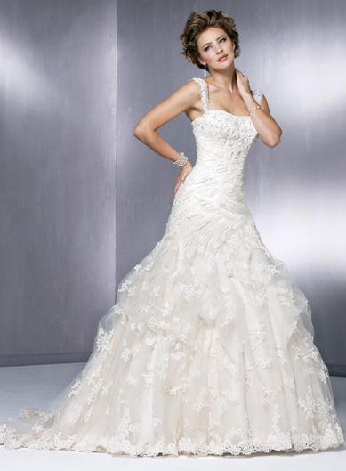 Our fashion style of wedding dress combines all the essence of the traditional beauty and combines the extraordinary modern elements. Fancy silhouette with charming elements creates a fantastic look. Sumptuous wedding dresses appreciate soft neckline dotted with glittering embroidery and beaded motifs over the pleated bodice. Natural waistline reveals the full skirt running down to the floor with a graceful chapel train.