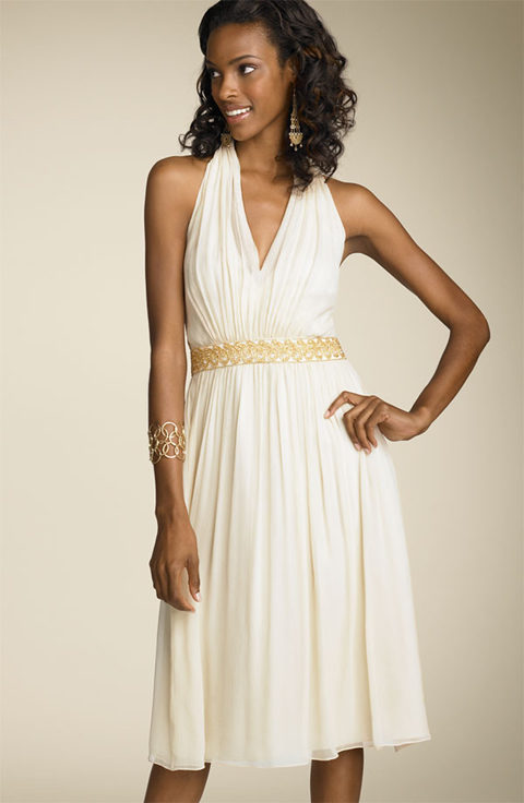 New Style Halter Chiffon V-neck Style Mid Length Pleated Low Back Wedding Dress